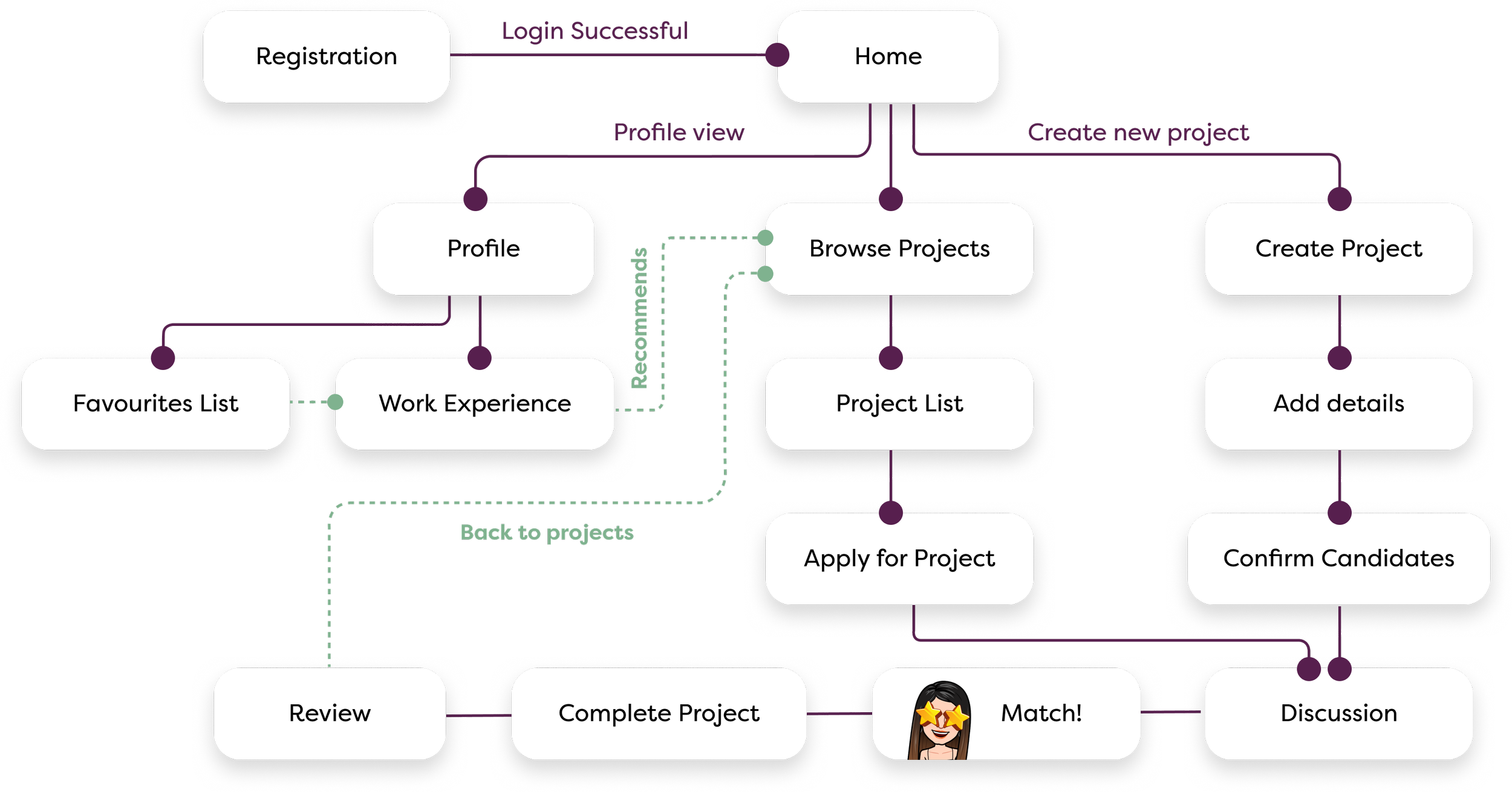 To outline all the neccessary functionality I created a simple flow diagram of the main tasks that the user can do. One of the flows is shown below.
